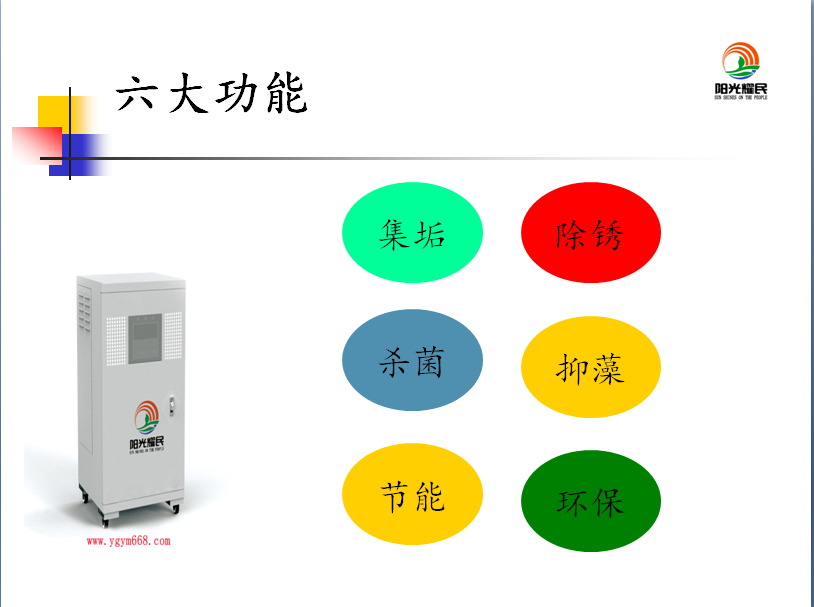 2. 抑藻:電氣分解所生成的臭氧(O3),雙氧水(H2O2) 對于菌落有良好的殺滅作用,并且在復頻電、磁場的作用下,微生物的細胞壁和細胞膜受到嚴重的損傷,不能在水中繼續生存和繁殖,從而達到了抑藻的目的和大大降低管道被細菌腐蝕的速度,延長了管道使用壽命。